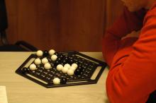 Gyuri, az egyik játszótársunk elhozta, így megismerhettük ezt az érdekes játékot is. Ha éppen játszótárs nélkül vagy, ezzel akkor is tudsz játszani. Kiindulásképpen az összes golyó a táblán van. Úgy kell lépni - vagyis egyik golyóval átugrani egy másikat és azt levenni -, hogy végén csak egyetlen egy golyó maradjon. Ha sikerül: „nyertél”, ha nem: próbálhatod újra!