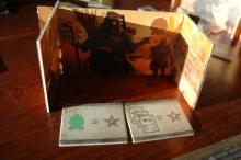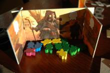 A paravánunk mögött a játék elején kihúzott két értékelő lapka. A végén mindenkinek ki kell a sajátjai közül az egyiket választani, és aszerint értékelni, pontokat szerezni. (Nyílván azt, amelyik több pontot ad.) Itt a képen pl. a baloldali azt jelenti, hogy ahány zöld Túlélőd van, annyi pontot kapsz.