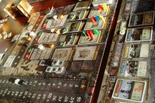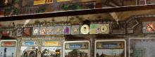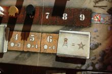 A Körjelző sáv. A játék elején két értékelő lapkát teszünk véletlenszerűen rá, a 3. kör és az utolsó 6. kör végén a lapkák szerint mindenki értékel, és pontot kap. Pl. jelen esetben az látható, hogy a 3 kör végén a jelzett Felszerelés-kártyák 3-3 pontot hoznak neked.