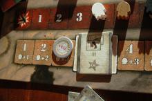 … annyit kell jobbra mozgatni a jelölődet ezen a Sebesülés-sávon. A következő kör elején mindenki kiértékeli a sávját, a sebesülés jelölőtől balra lévő összes mező hatását érvényesíteni kell: Fosztogató-sávon mozgatás, pont/pontok vesztése, stb.